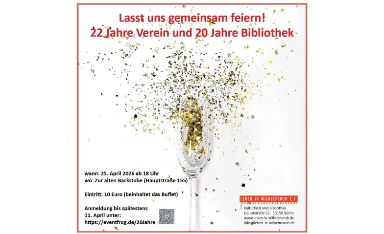 Wir freuen uns auf einen fröhlichen Abend im Kreis unseres Vereins und darauf, gemeinsam auf 20 Jahre Bibliothek und viele engagierte Vereinsjahre anzustoßen.