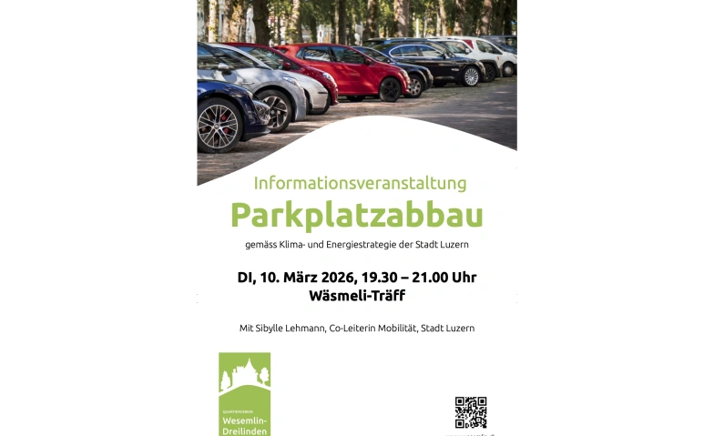 Informationsveranstaltung zum Parkplatzabbau im Quartier Wäsmeli-Träff im Quartierzentrum Wesemlin, Landschaustrasse 6, 6006 Luzern Tickets