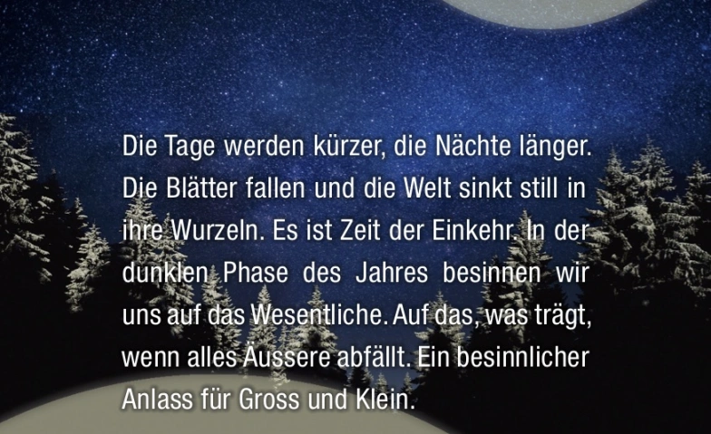 Die Tage werden kürzer, die Nächte länger. Die Blätter fallen und die Welt sinkt still in ihre Wurzeln. Es ist Zeit der Einkehr. In der dunklen Phase des Jahres besinnen wir uns auf das Wesentliche. Auf das, was trägt, wenn alles Äussere abfällt. Ein besinnlicher Anlass für Gross und Klein.