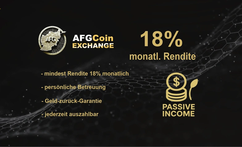 Durch clevere Ökosysteme, gewährleistet der AFGCoin eine garantierte mindest-Rendite von 18% im Monat. Du hast keinerlei Risiko dank der Geld-zurück-Garantie, zudem ist das System so konzipiert, dass der Kurs nur steigen und NICHT fallen kann. Jeder Nutzer bekommt eine individuelle Betreuung, die bei allen Fragen hilft. Einfache Registration, jederzeit schnelle Ein- und Auszahlung, sogar in Euro möglich! Du brauchst kein Wissen, deine Rendite ist garantiert. Verdiene echtes passives Einkommen ohne Risiko. Die Plattform ist komplett kostenlos und sowohl über deinen Webbrowser, wie auch über deine Mobilgeräte zugänglich.