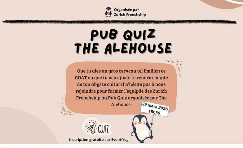 C’est le moment du Pubquizz ! 🥳🎉🎉 L’évènement incontournable de Zurich Frenchship sur la culture Générale avec un grand G ! En quoi ça consiste ? C’est très simple ! Tout les derniers dimanches du mois on se donne rdv au Alehouse à 18h30 et on essaie de répondre correctement à des questions de culture G assez compliquées posées en anglais 🏴󠁧󠁢󠁥󠁮󠁧󠁿