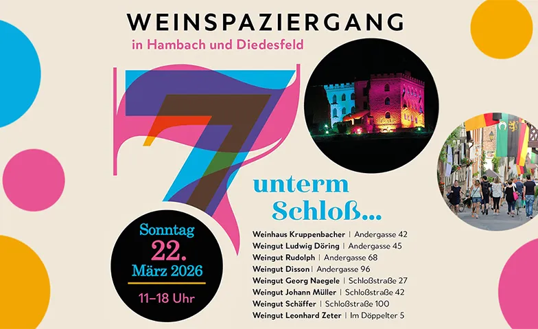 Sieben Hambacher und ein Diedesfelder Weingut öffnen am Sonntag Keller, Küche und Vinotheken für Sie! In jedem Weingut erwartet Sie eine feine Auswahl an sieben Weinen und Sekten, sowie kleine Köstlichkeiten aus den Gutsküchen. Genießen Sie bei einem kleinen Frühlingsspaziergang, einer Kutschfahrt oder unserem (MOD)Shuttledienst Pfälzer Gastlichkeit und ausgezeichnete Weine in den romantischen Höfen unterm Hambacher Schloss.