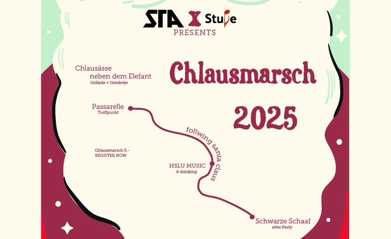 Der Abend beginnt um 17:30 mit Glühwein und Grillade, welche uns in Weihnachtsstimmung bringt🧀. Um 19:30 Uhr geht es dann mit Glühwein, Fackeln und Chlausmützen unseren Marsch Richtung Luzern. Nach einem Stopp in der HSLU Musik endet der Abend gebührend bei der Afterparty im Schwarzen Schaf. 🎉