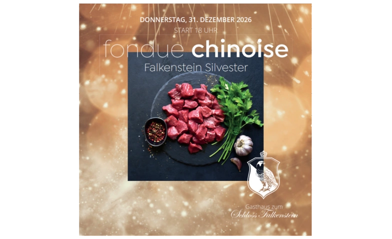Feiern Sie Silvester mit unserem beliebten Fondue Chinoise im Falkenstein! Ab 18:00 Uhr servieren wir unser exklusives Silvester-Menü inklusive einem reichhaltigen Vorspeisen- und Dessertbuffet à discrétion. Geniessen Sie 150g handgeschnittenes Wynentaler Rindfleisch und 50g Poulet, begleitet von hausgemachten Saucen, frischem Gemüse, eingelegten Früchten, Pommes Frites und Reis.