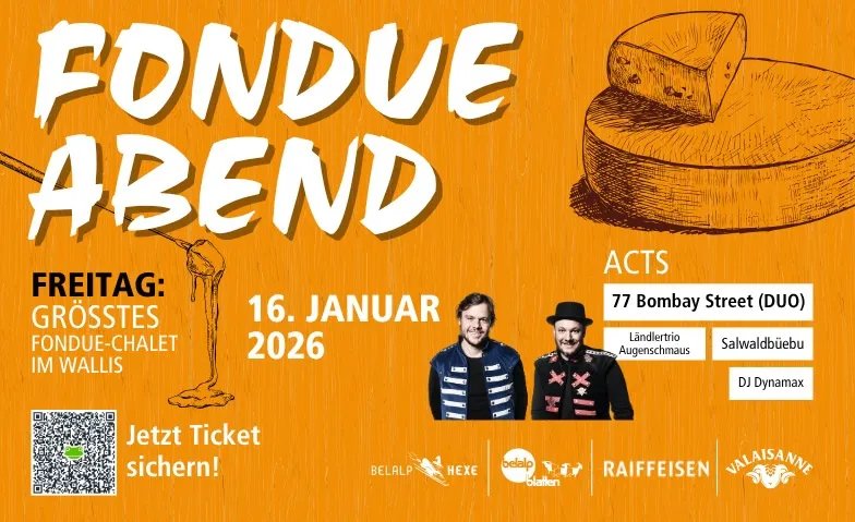 Serviert wird ein cremiges Walliser Fondue à discrétion von unserem Partner Walker AG, begleitet von feinen Seewer-Weinen und kühlen Drinks. Zwischen dampfenden Caquelons, Lichterglanz und mystischer Deko entsteht eine Stimmung, wie sie nur im Oberwallis zu finden ist – warm, echt und einfach magisch.