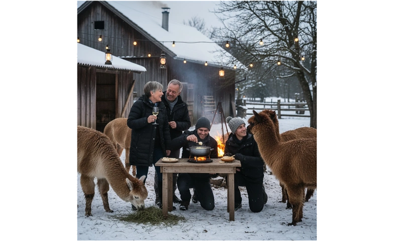 Beim Alpaka Fondue Abend erwartet die Gäste ein einzigartiges Erlebnis inmitten der flauschigen Alpakas.