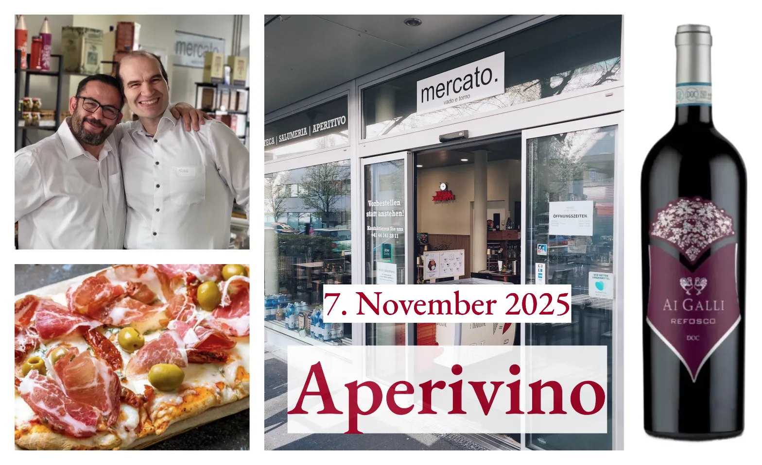 Michele Sarancino, langjähriger Stammgast bei NetWorkingBaden, stellt uns sieben ausgewählte Weine seiner APT Weine GmbH vor: vom Prosecco über Weiss- und Rotweine bis hin zum Dessertwein. Begleitet wird die Degustation von feinen italienischen Apéro-Häppchen, süssen Spezialitäten und Käse aus dem Sortiment von Orfeo Ciccarese und seinem Team im mercato - vado e torno.