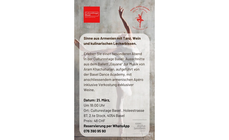 Erleben Sie einen einzigartigen Abend mit der Basel Dance Academy, die faszinierende Ausschnitte aus dem von Aram Khachaturian komponierte Ballett "Gayane" präsentiert. Tauchen Sie ein in die lebendige Kultur Armeniens bei einem exklusiven armenischen Apéro.