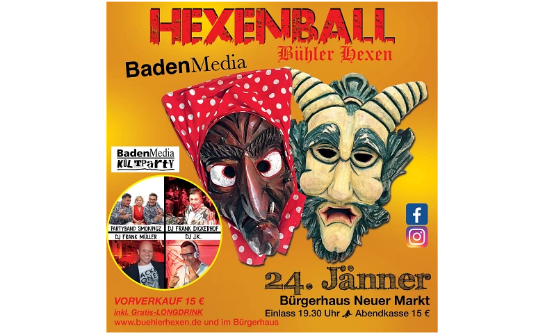 Dieses Jahr starten die Bühler Hexen die Fastnachtssaison wieder mit einem Highlight. Nach dem erfolgreichen Start des neuaufgelegten Hexenball, feiern wir zusammen mit Badenmedia im Bürgerhaus wieder den BHBall. Im großen Saal Live on Stage die "Partyband Smokingz" zusammen mit DJ Frank Dickerhof. In der Hexenbar steigt die Kultparty mit dem „DJ J.K“ und leckeren Cocktails.