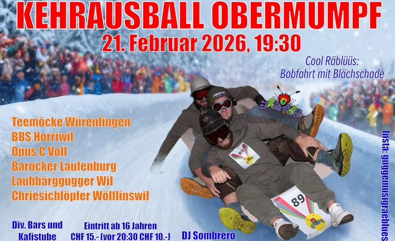 Zum Abschluss der jährlichen Fasnacht veranstalten wir im heimischen Obermumpf unseren Kehrausball. Die Türöffnung ist jeweils um 19:30 Uhr und ab 20:15 Uhr treten stündlich Gastguggenmusiken auf. Zwischen den Guggen sorgt DJ Sombrero für Partystimmung mit Hits aus allen Rubriken.