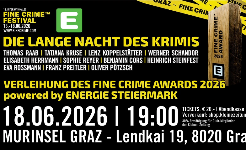 Am Donnerstag, dem 18. Juni 2026 um 19:00 Uhr, erreicht das Fine Crime Festival auf der Murinsel Graz seinen großen Höhepunkt. „Die Lange Nacht des Krimis“ versammelt zahlreiche namhafte Autorinnen und Autoren zu den legendären 6-Minuten-Lesungen – kurz, intensiv und garantiert spannungsgeladen. Mit dabei sind unter anderem Thomas Raab, Tatjana Kruse, Lenz Koppelstätter, Werner Schandor, Elisabeth Herrmann, Sophie Reyer, Benjamin Cors, Oliver Pötzsch, Heinrich Steinfest, Eva Rossmann und Franz Preitler. Durch den Abend führen Christian Bachhiesl und Robert Preis.