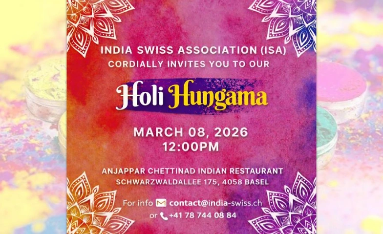 On March 08, 2026, join Holi Hungama organized by India Swiss Association (ISA) - a joyful, welcoming celebration of Holi, India’s Festival of Colors, right here in Basel.