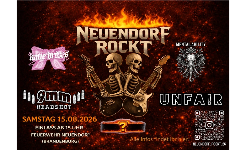 Das Line‑up umfasst Unfa!r, katie drives, Mental Ability sowie 9mm Headshot. Ob langjährige Rockfans oder Neugierige, die Bands aus der Region entdecken wollen, Neuendorf Rockt verspricht einen mitreißenden Abend voller Live‑Momente und Gemeinschaft.