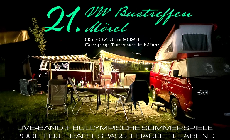 Es ist wieder soweit: vom 06. - 07. Juni 2026 feiern wir auf dem Camping Tunetsch in Mörel unser 21. VW Bustreffen. Auch dieses Mal soll es wieder etwas Besonderes sein. Aufgrund des riesen Erfolgs vom letzten Jahr wird auch bei diesem Treffen die Band "Double D" aus dem Wallis ein Konzert geben und ein Party-DJ das Wochenende für musikalische Untermalung sorgen. Natürlich gibt es am Freitag Abend wieder unser traditionelles Raclette Essen. Und die mittlerweile beliebten Bullympischen Sommerspiele werden ebenfalls wieder ausgetragen, bei denen tolle Preise winken. Freut euch auf Party, nette Leute, einen grossen Pool und ganz viel VW Busse aus allen Kategorien.