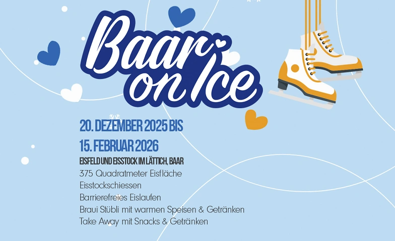 Vom 20.12.2025 bis 15.02.2026 feiert das Baar on Ice seine Premiere im Lättich Baar und bringt winterlichen Spass für Gross und Klein. Auf 375 m² Eisfläche erwartet dich ein abwechslungsreiches Programm: gemütliches Schlittschuhlaufen, spannender Hockeycup und gesellige Matches auf der Eisstockbahn.