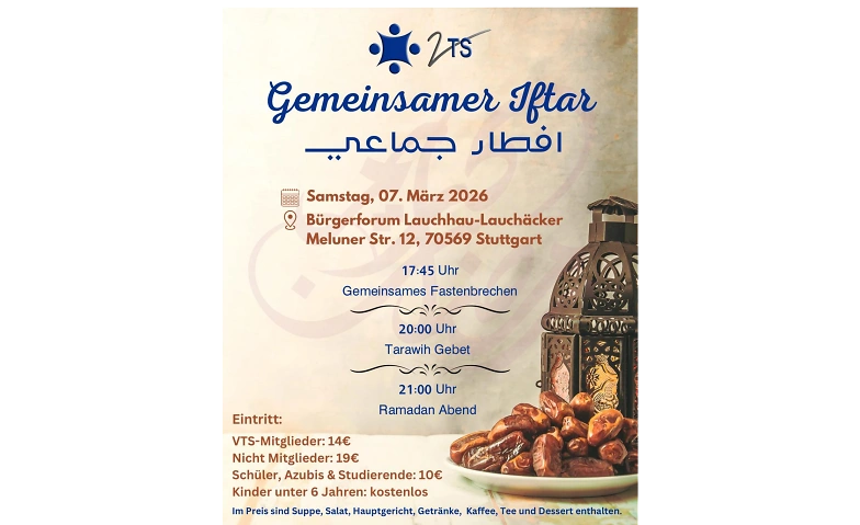 Gemeinsamer Iftar - لمة و سهرة رمضانية in Stuttgart Bürgerforum Lauchhau-Lauchäcker, Meluner Straße 12, 70569 Stuttgart Tickets