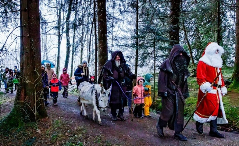An der Haltestelle Rietli werden die Teilnehmer von Schmutzli und Esel empfangen und auf einem kurzen Spaziergang zur festlich geschmückten Waldlichtung begleitet.