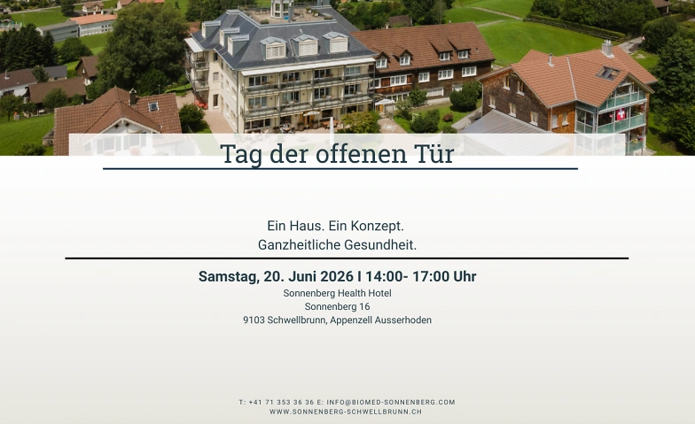Das Sonnenberg Biomedical Health Hotel in Schwellbrunn lädt zum Tag der offenen Tür ein. Besucherinnen und Besucher erhalten Einblicke in das ganzheitliche Konzept des Hauses, das moderne biologische Medizin, Erholung im Health Hotel und gesundheitsorientierte Ernährung miteinander verbindet.