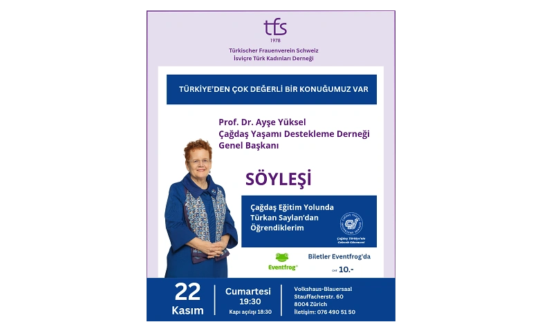 TFS Söyleşi Prof. Dr. Ayşe Yüksel ÇYDD VOLKSHAUS BLAUERSAAL, Stauffacherstrasse 60, 8004 Zürich Tickets
