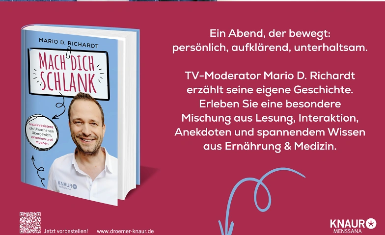 Erleben Sie TV-Moderator und Buchautor Mario D. Richardt live: humorvoll, ehrlich und voller spannender Aha-Momente. In seinem Live-Programm zeigt er, wie Sie mit der richtigen Ernährung Insulinresistenz stoppen, Ihren Stoffwechsel aktivieren und dauerhaft abnehmen – ohne Hungern. Persönliche Geschichten, überraschende Fakten, alltagstaugliche Tipps und interaktive Momente machen den Abend zu einer unterhaltsamen und motivierenden Entdeckungsreise für ein leichteres, gesünderes Leben.