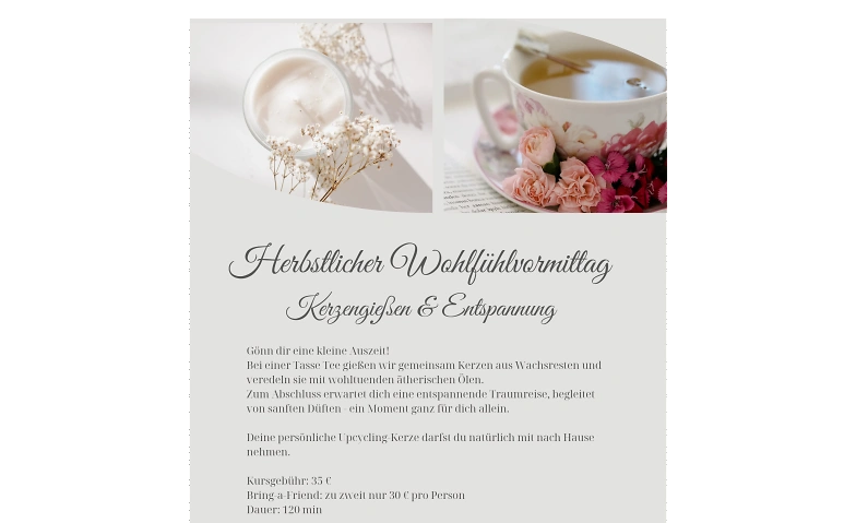 Bei einer Tasse Tee gießen wir gemeinsam Kerzen aus Wachsresten und veredeln sie mit wohltuenden ätherischen Ölen.