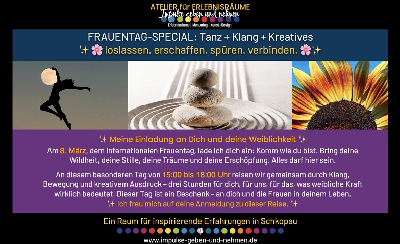 An diesem besonderen Tag von 15:00 bis 18:00 Uhr reisen wir gemeinsam durch Klang, Bewegung und kreativem Ausdruck – drei Stunden für dich, für uns, für das, was weibliche Kraft wirklich bedeutet.🌸
