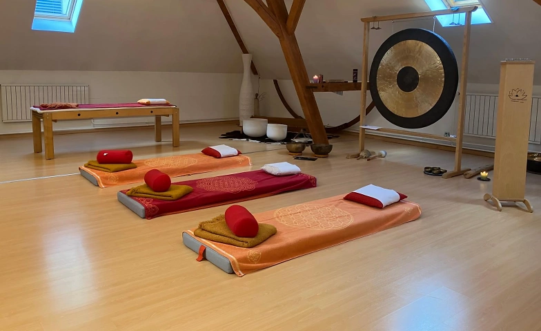 Dazu gehört ein Liegeplatz im Klangraum auf einem Mätteli, ausgestattet mit Decken und Kissen.