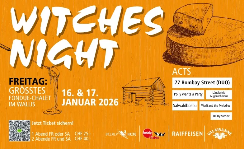 Witches Night 2026 Tickets Witches Night 2026 Samstag, 17.01.2026, 18:00 Uhr Alter Tennisplatz Blatten b. Naters, 3914 Blatten b. Naters, CH Tickets
