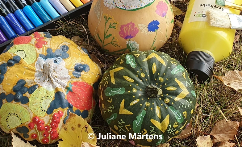 Bitte mitbringen: eine Dose oder Karton, um den Kürbis nach Hause zu transportieren; eine Schürze oder Sachen, die dreckig werden dürfen (Wir arbeiten mit Acrylfarbe. Wenn diese auf Stoff kommt, lässt sie sich teils nur schwer wieder entfernen.)
