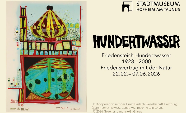 Friedensreich Hundertwasser (1928–2000) | Dienstag, 26.05.2026, 10:00 Uhr | Stadtmuseum Hofheim, 65719 Hofheim am Taunus, DE | Tickets | |