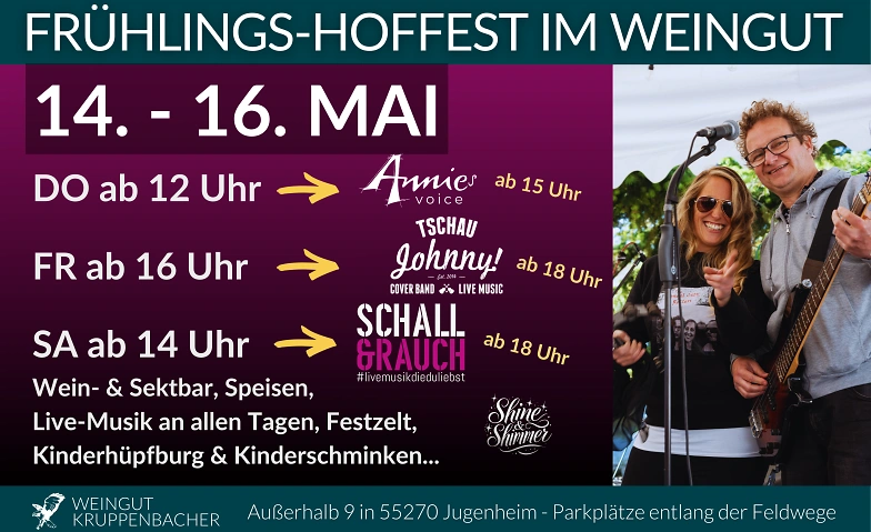 Frühlings-Hoffest im Weingut Tickets Frühlings-Hoffest im Weingut Freitag, 15.05.2026, 16:00 Uhr Weingut Kruppenbacher, 55270 Jugenheim in Rheinhessen, DE Infos