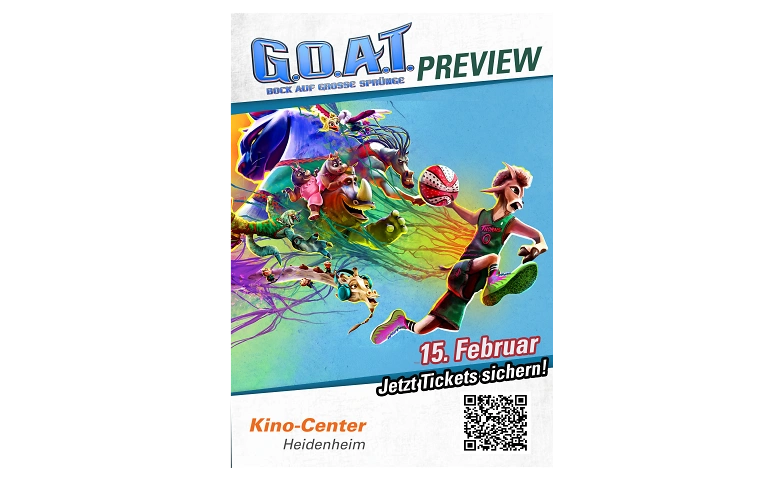 G.O.A.T. - Bock auf große Sprünge Kids Preview | Sonntag, 15.02.2026, 15:30 Uhr | Kino-Center, 89520 Heidenheim an der Brenz, DE | Tickets | |