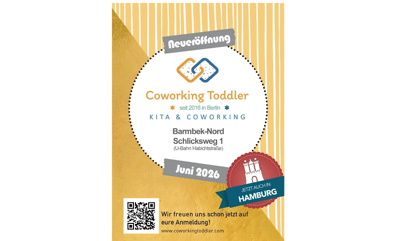 KITA - Neueröffnung Juni 2026 Tickets KITA - Neueröffnung Juni 2026 Freitag, 23.10.2026, 07:00 Uhr KITA Coworking Toddler, 22307 Hamburg, DE Tickets