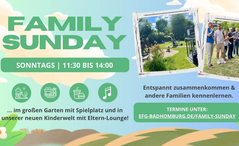 Jeder ist herzlich eingeladen! Einfach bei uns in der Sodener Straße 18 im Gemeindezentrum vorbeischauen. Kein Eintritt. Du hast Fragen? www.efg-badhomburg.de/family-sunday - oder schreib uns: redaktion@efg-badhomburg.de