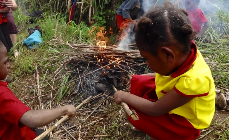 Sie zeigen euch in ihrem Film wie sie das gemacht haben. Kinder aus Papua Neuguinea lernen wie man aus Palmblättern ein Feuer entfacht und rösten Süßkartoffeln. Und Kinder aus Kamerun zeigen uns wie sie ihr Leibgericht kochen.