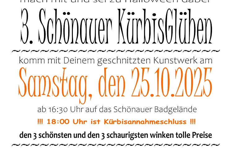 im Pavillon des Badgeländes von Schönau findet zum 3.Mal unser KürbisGlühn statt. Jeder kann bis 18 Uhr mit seinen geschnitzten Kürbisköpfen vorbeikommen - es werden die 3 schaurigsten und die 3 lustigsten Kunstwerke prämiert. Bis zur Preisverleihung kann man seine Treffsicherheit mit Pfeil und Bogen beim Kürbisschießen unter Beweis stellen. Wer möchte, kann im Halloweenkostüm kommen und sich beim Kinderschminken noch etwas aufpeppen lassen. Auch dieses Jahr wird wieder ein großes Herbstfeuer entzündet und kulinarisch ist für jedermann etwas dabei.