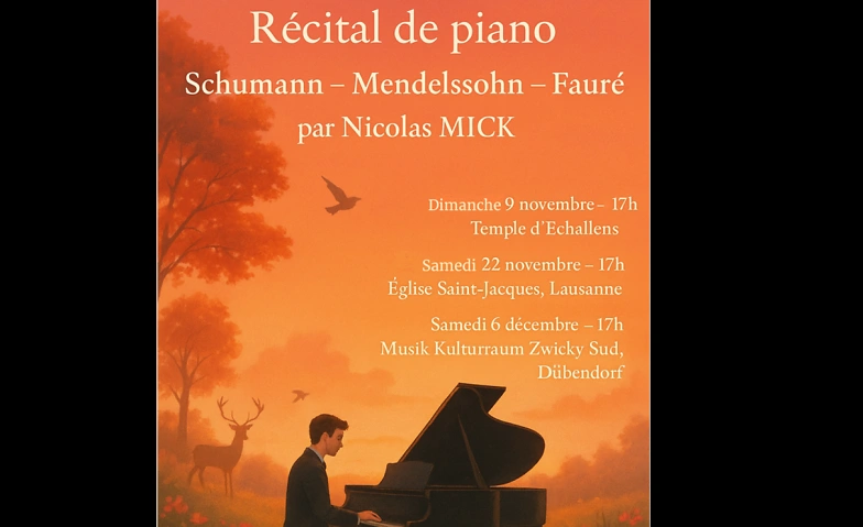 Entre la finesse française et la profondeur allemande, le pianiste Nicolas Mick invite le public à un voyage musical sensible, de Schumann à Fauré, en passant par Mendelssohn. Un moment suspendu, ouvert à toutes les oreilles sous les doigts de Nicolas Mick, le piano devient un véritable passeur d'émotions. Dans ce programme << franco-allemand », l'artiste propose une traversée du romantisme européen, entre la passion fiévreuse de Robert Schumann, la clarté mélodique de Félix