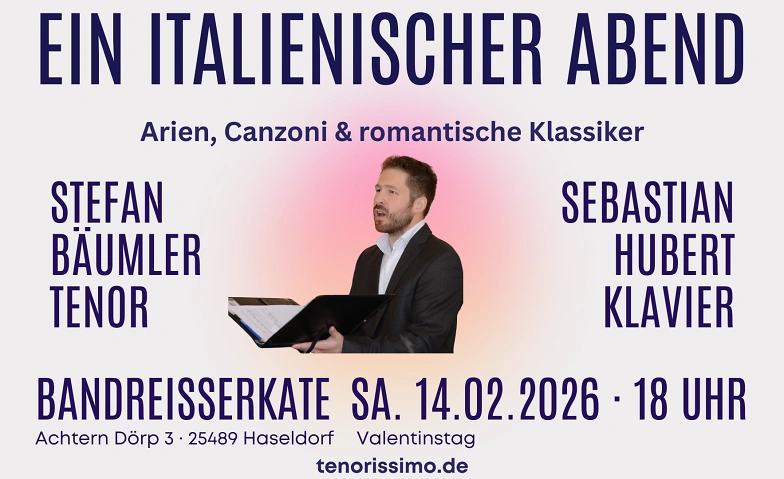 Am 14. Februar 2026 um 18 Uhr lädt die Historische Bandreißerkate zu einem besonderen musikalischen Highlight ein: Tenor Stefan Bäumler und Pianist Sebastian Hubert präsentieren ihr Programm „Ein italienischer Abend“ – ein stimmungsvoller, charmant moderierter Konzertabend voller mediterraner Lebensfreude, Emotion und musikalischer Eleganz.