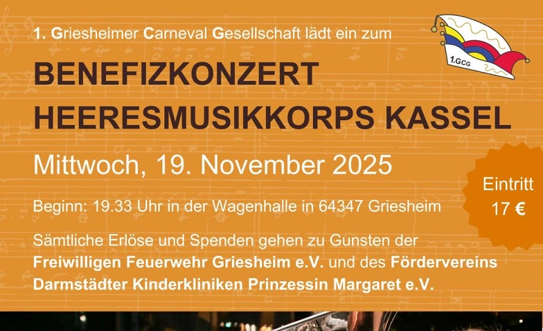 Fastnacht bringt Freude und dies ist uns ein Anlass und ein Anliegen, an die Menschen zu denken, die Unterstützung benötigen. Der Erlös dieses Konzerts geht zu Gunsten des Fördervereins Darmstädter Kinderkliniken Prinzessin Margarete e.V und des Fördervereins Freiwillige Feuerwehr Griesheim e.V.. Wir freuen uns, das Benefizkonzert erneut mit dem Heeresmusikkorps der Bundeswehr aus Kassel, unter der Leitung von Hauptmann Christoph Schiffers, durchzuführen. Für das leibliche Wohl ist gesorgt. Es besteht die Möglichkeit sich an Informationsstände der beiden Spendenempfänger über deren Arbeit zu informieren.