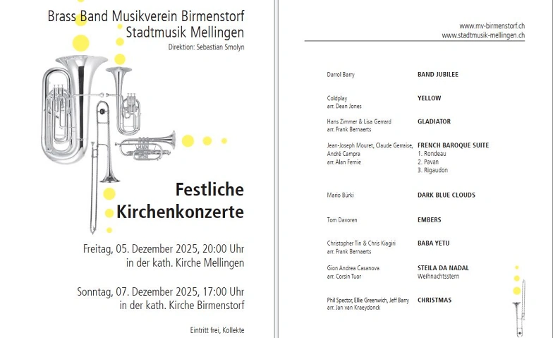 Der Musikverein Birmenstorf und die Stadtmusik Mellingen laden Sie herzlich zu den diesjährigen Kirchenkonzerten ein. Seit einigen Jahren musizieren wir erfolgreich in einer harmonischen Spielgemeinschaft – und auch dieses Jahr dürfen sich unsere Besucherinnen und Besucher auf ein abwechslungsreiches und stimmungsvolles Programm freuen.
