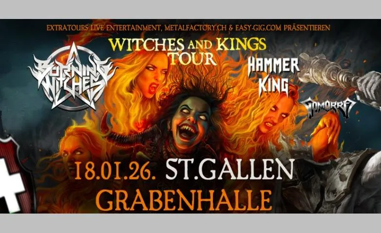 Wenn BURNING WITCHES die Bühne betreten, lassen die Ladies die Welt mit der unbändigen Power ihres Heavy-Metal-Sounds erbeben!   Auf ihrem sechsten Studioalbum "Inquisition", das am 22. August 2025 via Napalm Records erscheint, kehrt das Schweizer Quintett mit einem donnernden Gebräu zurück und zeigt sich dabei von seiner bisher düstersten Seite. Thematisch handelt das Album von der mittelalterlichen Frauenverfolgung, religiöser Unterdrückung und dem unzerbrechlichen Geist des Widerstands. Mit 12 neuen Tracks entfacht das Album ein loderndes Feuer aus donnernden Riffs, gewaltigen Drums und markerschütterndem Gesang - doch diesmal in einer Klanggewalt, die dunkler, epischer und kompromissloser ist als jemals zuvor! Wie das Vorgängeralbum "The Dark Tower" (2023) besticht "Inquisition" mit einer starken Produktion von Damir Eskic (Destruction) und V.O. Pulver (Little Creek Studio, Pro-Pain, Destruction), die den Sound ihrer neuen Ära zur Geltung bringt und das hymnische Songwriting von Gründungsgitarristin Romana Kalkuhl unterstreicht. Mit "Inquisition" präsentieren BURNING WITCHES ihr bisher intensivstes Album - ein düsteres und vor Kraft strotzendes Manifest zwischen Licht und Schatten. Mit epischen Melodien, bedrohlichen Riffs und einer unvergleichlichen Energie fangen die Schweizer Hexen mal wieder die Essenz des klassischen Heavy Metal ein, die sie mit moderner Härte vereinen und beweisen, dass diese Band stärker ist als jemals zuvor! HAMMER KING aus Deutschland um Titan Fox V (ex- Ross The Boss), Dolph Aidan Macallan (ex- Saltatio Mortis) und "Kleveland's most timeless guitarist" Gino Wilde wird vervollständigt durch Günt von Schratenau (The New Black). HAMMER KING verbreiten mit ihrem traditionellen Heavy Metal die Botschaften und Legenden ihres königlichen Namensgebers. GOMORRA sind hier, um mit ihrem Power die Heavy Metal Szene aufzumischen. Schnelle, groovige Riffs, Dynamik und viel Energie erwartet euch mit diesen fünf Jungs aus der Region Brugg. [gallery columns="4" ids="eyJ1cmwiOiJodHRwczpcL1wvd3d3LmdyYWJlbmhhbGxlLmNoXC93cC1jb250ZW50XC91cGxvYWRzXC8yMDI1XC8wNlwvMjAyNl8wMV8xOF9CdXJuaW5nV2l0Y2hlcy5qcGciLCJ0aXRsZSI6IjIwMjZfMDFfMThfQnVybmluZ1dpdGNoZXMiLCJjYXB0aW9uIjoiIiwiYWx0IjoiIiwiZGVzY3JpcHRpb24iOiIifQ==,eyJ1cmwiOiJodHRwczpcL1wvd3d3LmdyYWJlbmhhbGxlLmNoXC93cC1jb250ZW50XC91cGxvYWRzXC8yMDI1XC8wNlwvMjAyNl8wMV8xOF9IYW1tZXJLaW5nLmpwZyIsInRpdGxlIjoiMjAyNl8wMV8xOF9IYW1tZXJLaW5nIiwiY2FwdGlvbiI6IiIsImFsdCI6IiIsImRlc2NyaXB0aW9uIjoiIn0=,eyJ1cmwiOiJodHRwczpcL1wvd3d3LmdyYWJlbmhhbGxlLmNoXC93cC1jb250ZW50XC91cGxvYWRzXC8yMDI1XC8wNlwvMjAyNl8wMV8xOF9Hb21vcnJhLmpwZyIsInRpdGxlIjoiMjAyNl8wMV8xOF9Hb21vcnJhIiwiY2FwdGlvbiI6IiIsImFsdCI6IiIsImRlc2NyaXB0aW9uIjoiIn0="]