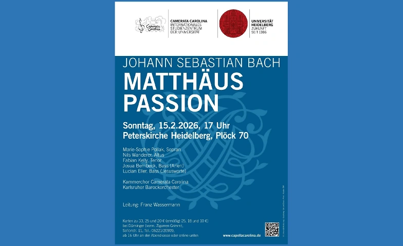 Am Sonntag, 15. Februar 2026, 17 Uhr präsentiert der Kammerchor Camerata Carolina in der Peterskirche Heidelberg die Matthäuspassion mit Vokalsolistinnen und -solisten: der Sopranistin Marie-Sophie Pollak, dem Altus Nils Wanderer, dem Tenor Fabian Kelly und dem Bassisten Josua Bernbeck. Den Orchesterpart hat das Karlsruher Barockorchester.