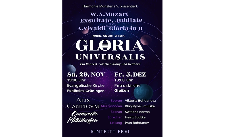 ...so heißt das neue Konzertprogramm des Chores Alis Canticum der Harmonie Münster e.V. Gleich zwei Werke kommen zu Gehör: 1. Mozart Exsultate, Jubilate, ein Stück welches von dem gerade mal 17 jährigen Mozart komponiert wurde. Gesungen von der Sopranistin Viktoria Bohdanova und begleitet von Musikern des Projektchores Camarata Mittelhessen. 2. Vivaldi Gloria in D, Ehre sei Gott in der Höhe. Festliche, dramatische und tänzerische Stücke. Gesungen durch den Chor Alis Canticum und begleitet vom Orchester Camerata Mittelhessen. Lassen Sie sich zu mehr als einer musikalischen Reise mitnehmen. Es freuen sich die Sängerinnen und Sänger des Alis Canticum, die Solistinnen, das Orchester Camerata Mittelhessen und der Teamvorstand der Harmonie Münster e.V. auf ihren Konzertbesuch.