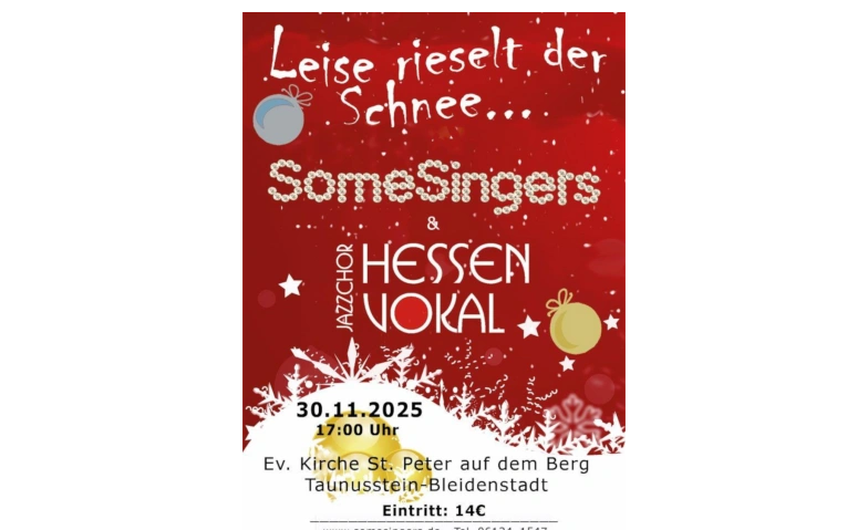 Gemeinsames Weihnachtskonzert des Vokalensembles SomeSingers unter der Leitung von Ernie Rhein und dem gemischten Chor Hessen Vokal aus Marburg unter der Leitung von Uwe Henkhaus. Weihnachtslieder aus aller Welt und allen Epochen erwarten Sie in der klangvollen Akustik der ev. Kirche St Peter auf dem Berg in Taunusstein.