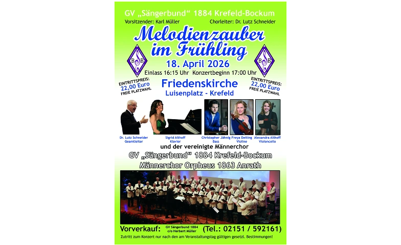 Der Bockumer Sängerbund setzt die erfolgreiche Reihe der Veranstaltungen in der Friedenskirche am 18. April 2026 mit einem Konzert unter dem Motto „Melodienzauber im Frühling“ fort.
