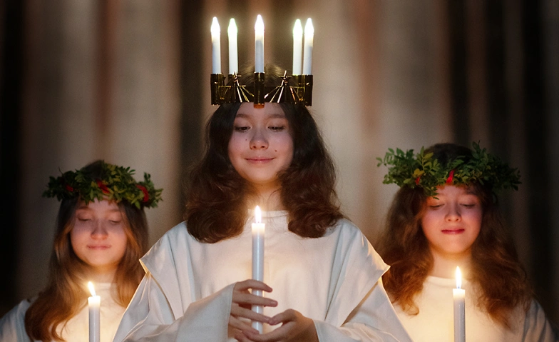 Mit Kerzenkrone und weißen Gewändern mit rotem Band wird in Schweden am 13. Dezember das Fest zum Gedenktag der heiligen Lucia gefeiert. Traditionell folgt der Chor singend mit Kerzen in den Händen der heiligen Lucia.