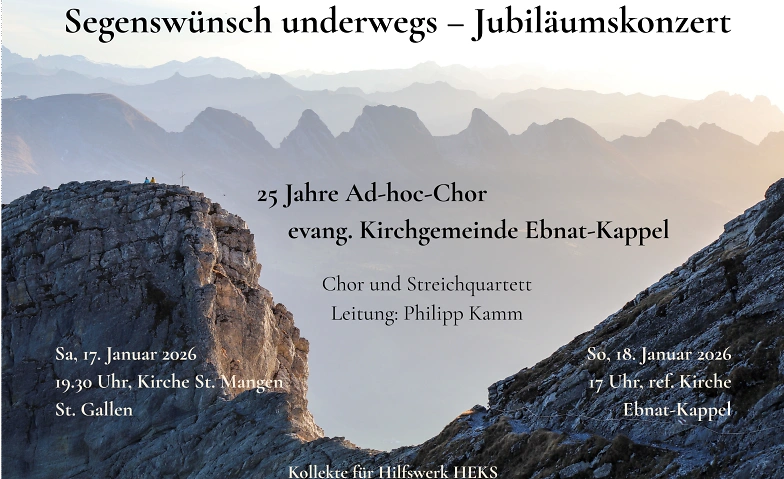 Der Ad-hoc-Chor der evang.-ref. Kirchgemeinde Ebnat-Kappel  feiert sein 25-jähriges Unterwegssein als Chorgemeinschaft mit zwei Benefizkonzerten - und einer Reise zurück zu den ersten Eigenkompositionen: Die "Segenswünsche" (2006) sind vertonter Zuspruch an uns alle, mal fröhlich beschwingt, mal meditativ, mal aufrüttelnd. In "underwegs" (2008) steht die universelle Erfahrung unseres Daseins als ein Lebens-Weg im Mittelpunkt, mit Aufbrüchen, Hindernissen, Gratwanderungen, Zwischenhalten und Weggefährten.