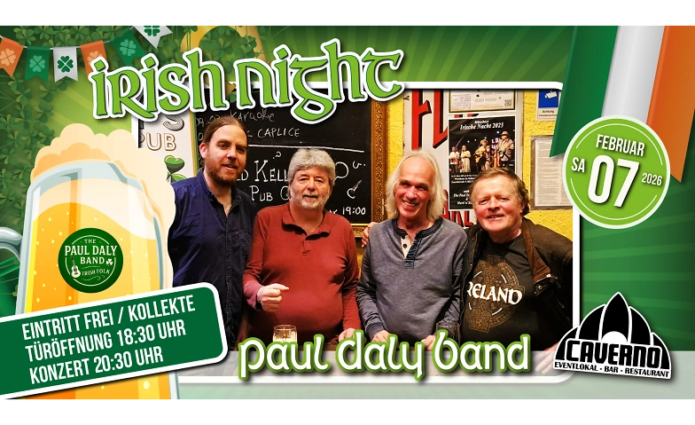 Die Paul Daly Band bringt irische und internationale Folk Musik mit ihrem ganz eigenen Stil auf die Bühne und überrascht das Publikum immer wieder mit frischen, unerwarteten Elementen. Die Musiker stammen aus Irland, Grossbritannien, den USA und Deutschland, und trotzdem ist die in München beheimatete Band überall zu Hause, von gemütlichen Irish Pubs bis hin zu grossen Konzerthallen.