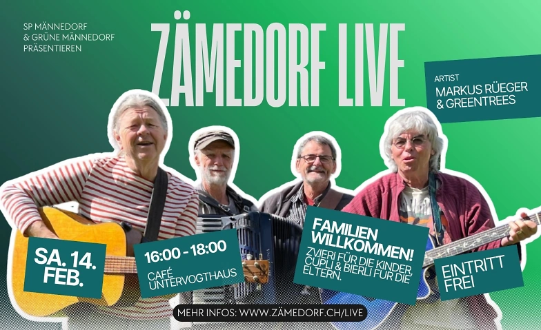 Am Samstag 14. Februar 2026 wird das Café Untervogthaus zum Treffpunkt für Musik, Lebensfreude und Gemeinschaft! Von 16:00 bis 18:00 Uhr lädt die SP Männedorf gemeinsam mit den Grünen alle Familien herzlich ein, mit Markus Rüeger & GreenTrees einen unvergesslichen Nachmittag zu erleben.