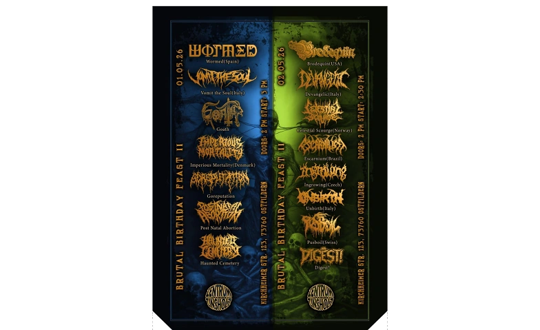 Mini Festival für die Fans der etwas härteren Gangart: Brutal Death Metal, Slam Death Metal, Technical Death Metal & Grindcore. Es erwarten dich folgenden Bands am ersten Tag: